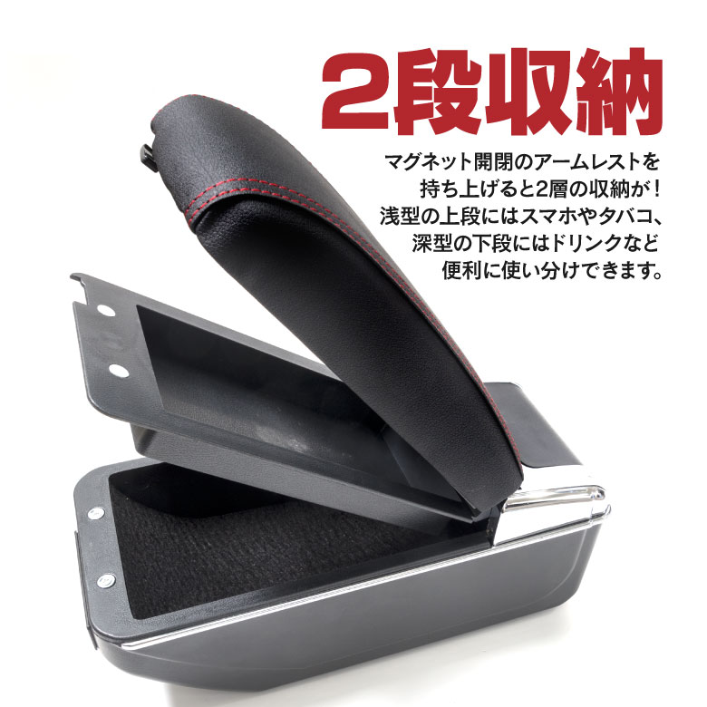 2段収納 マグネット開閉のアームレストを持ち上げると2層の収納が! 浅型の上段にはスマホやタバコ、深型の下段にはドリンクなど、 便利に使い分けできます。