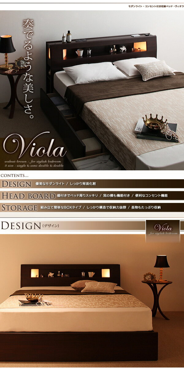 デザインも機能も収納も兼ね備えた、才色兼備の【Viola】ヴィオラ収納付きベッド!■直線的で洗練された、デザイン性の高いフォルム!■ライト・コンセント・キャビネットが付いた高機能のヘッドボード!■ホコリ対策もばっちり!組み立て簡単なBOXタイプ!■ウレタン塗装・背面化粧済みの高いスペック! 商品名 モダンライト・コンセント収納付きベッド Viola ヴィオラ ベッドフレームのみ ダブル 配送について こちらの商品はメーカーより直送いたします。