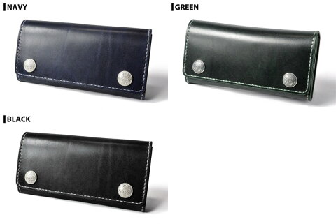 CAT:0000000114,0000000247■品名:三つ折りロングウォレット [B-3] ■素材:ルガトショルダー ■サイズ:195×95×30mm ■サンプルコンチョ: ネイビー・ブラック=S-229c(20mm)×2、グリーン=S-229(20mm)×2 ※こちらの商品はダブルコンチョ仕様となります。